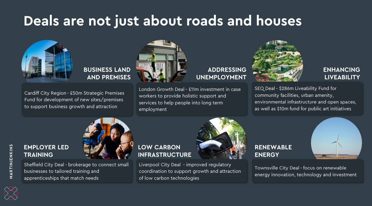 While we are still waiting for fuller details on these policies initiatives, there are lessons from how the city and regional deal model has been applied in the UK and Australia.