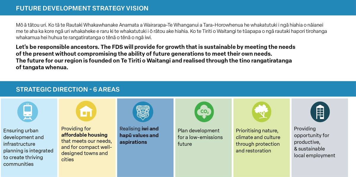 The Wairarapa-Wellington-Horowhenua Future Development Strategy (the Strategy) sets out how we plan to deliver well-functioning urban environments in our existing and future towns and cities over the next 30 years. The Strategy proposes where to prioritise housing and business development, as well as investment in infrastructure to support this development. The Strategy guides regional policy development, including Regional and District Plan changes in the future, as well as Land Transport Plans, infrastructure strategies, councils budgets (Long Term Plans) and other policies.