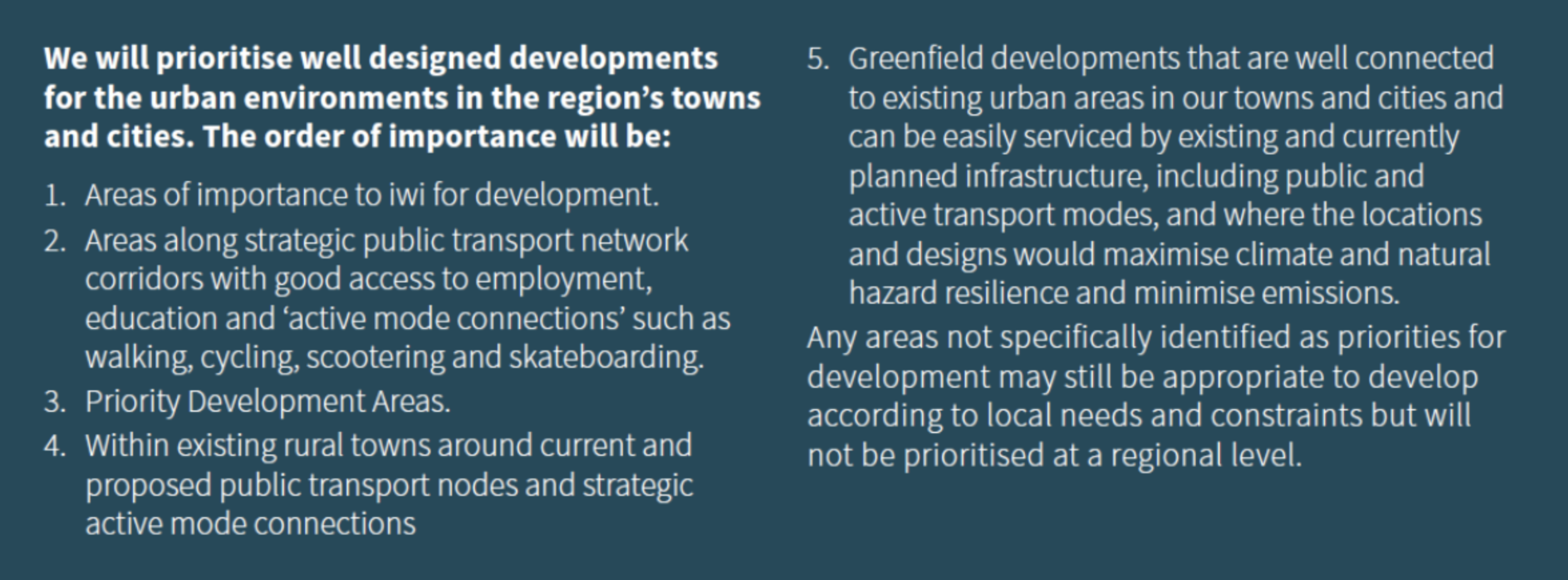 The Future Development Strategy vision includes our being responsible ancestors. It promotes a compact urban form that offers us the best opportunity to create the low-emissions and climate-resilient future our region needs and deliver on the outcomes sought by our strategic direction. To achieve this, the strategy prioritises future development as set out below.